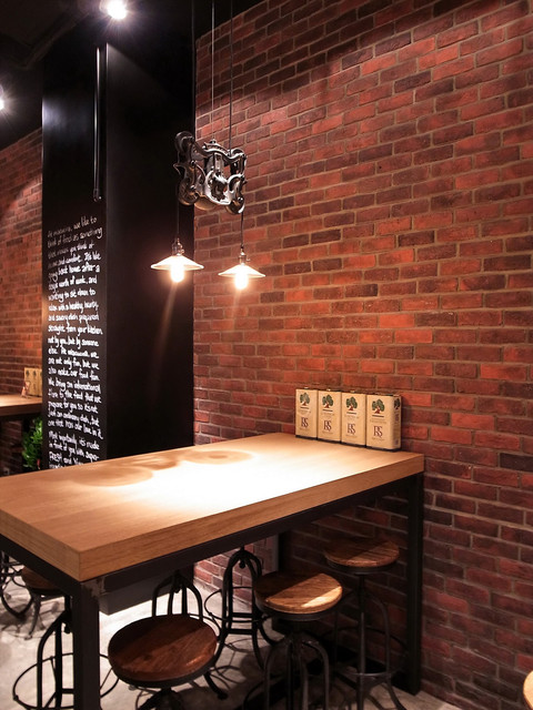 紅磚、復古家具、拼貼地磚、牛角壁飾、現代畫和設計感吊燈